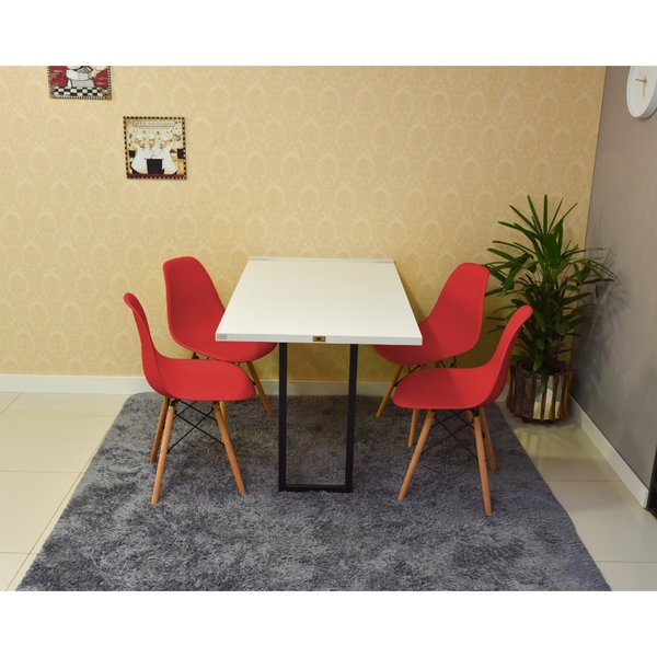 A mesa dobrável retrátil é fabricada em MDF de alta resistência, com base em pintura eletrostática, que não enferruja nem desbota. Já as cadeiras Eames Eiffel são confeccionadas com assento em polipropileno resistente e estrutura em madeira com reforço metálico, garantindo conforto e durabilidade.