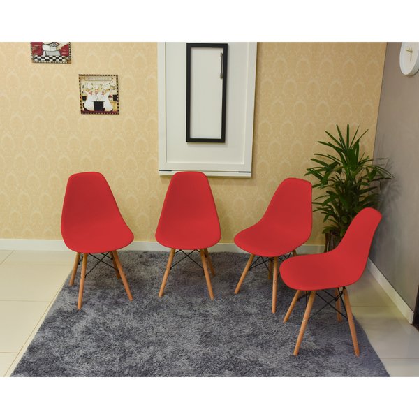- Material das cadeiras: Assento em polipropileno, base em madeira e metal