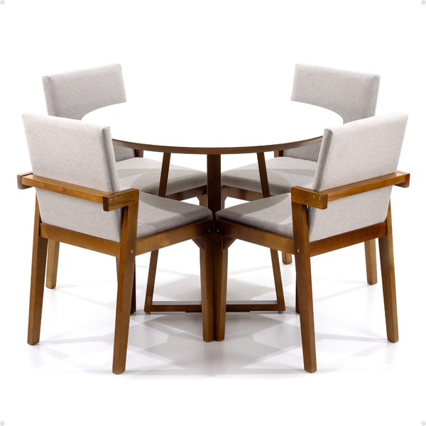 O Conjunto Mesa de Jantar Redonda Lara Premium com as Cadeiras Estofas Isabela também se destaca por ser confeccionado com materiais de alta qualidade. A Mesa de Jantar Redonda Lara possui a sua estrutura feita em Madeira Maciça (Eucalipto) e seu tempo feito em MDF de alta qualidade. As Cadeiras Isabela possuem a sua estrutura feita em Madeira de Eucalipto e seu assento e encosto são feitos em MDF revestidos com Tecido Linho, materiais resistentes que garantem uma longa vida útil ao produto.