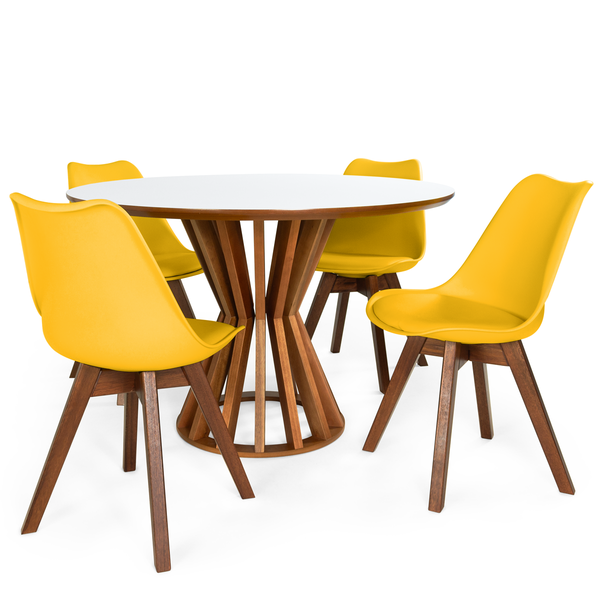 Conjunto Mesa de Jantar Redonda Cecília 120cm Branca com 4 Cadeiras Leda Vértice Amarelo