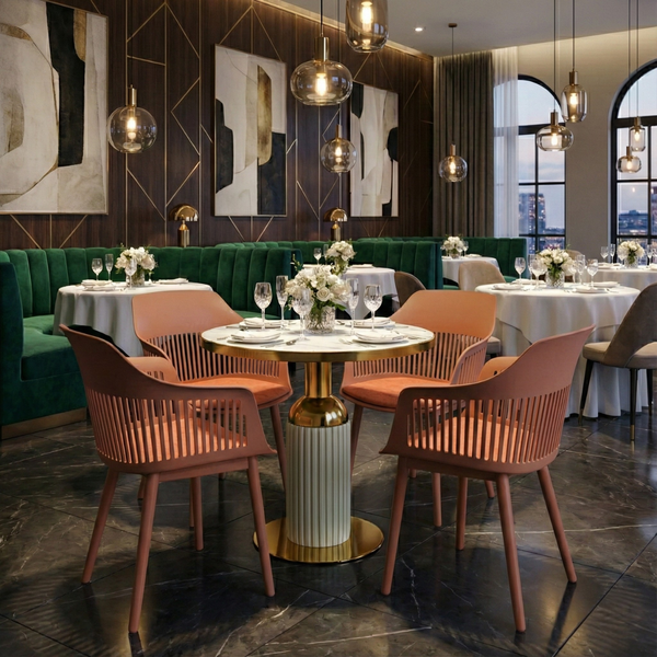 As cadeiras estofadas Marcela proporcionam o máximo de conforto graças aos assentos macios e ergonomicamente desenhados. Seu design moderno combina perfeitamente com a mesa, resultando em um conjunto harmonioso e atraente.