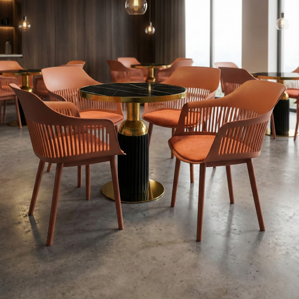 As cadeiras estofadas Marcela proporcionam o máximo de conforto graças aos assentos macios e ergonomicamente desenhados. Seu design moderno combina perfeitamente com a mesa, resultando em um conjunto harmonioso e atraente.