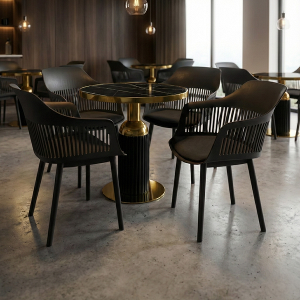 As cadeiras estofadas Marcela proporcionam o máximo de conforto graças aos assentos macios e ergonomicamente desenhados. Seu design moderno combina perfeitamente com a mesa, resultando em um conjunto harmonioso e atraente.