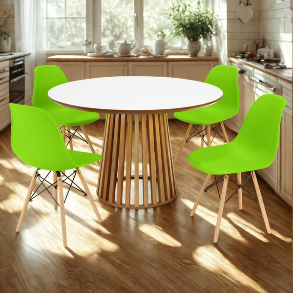 O Conjunto de Mesa de Jantar Redonda Luana 120cm com 4 Cadeiras Eames Eiffel da marca Made Decor é a escolha perfeita para quem deseja unir design moderno, conforto e funcionalidade em um só ambiente. Com acabamento amadeirado natural e cadeiras coloridas de estilo contemporâneo, esse conjunto transforma sua sala de jantar em um espaço sofisticado e acolhedor.