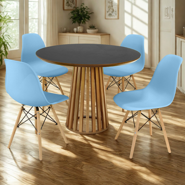 Conjunto Mesa de Jantar Redonda Luana Amadeirada Preta 100cm com 4 Cadeiras Eames Eiffel Azul Claro