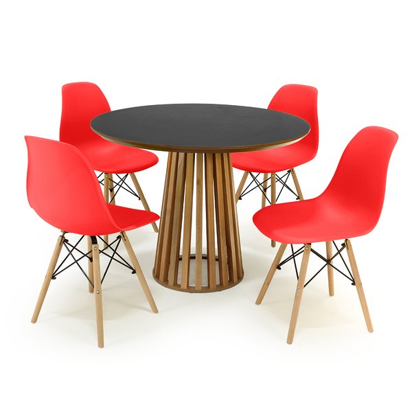 Conjunto Mesa de Jantar Redonda Luana Amadeirada Preta 100cm com 4 Cadeiras Eames Eiffel Vermelho