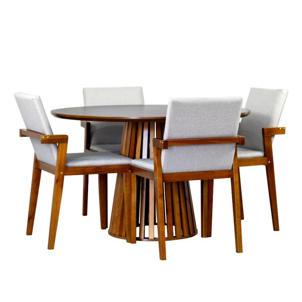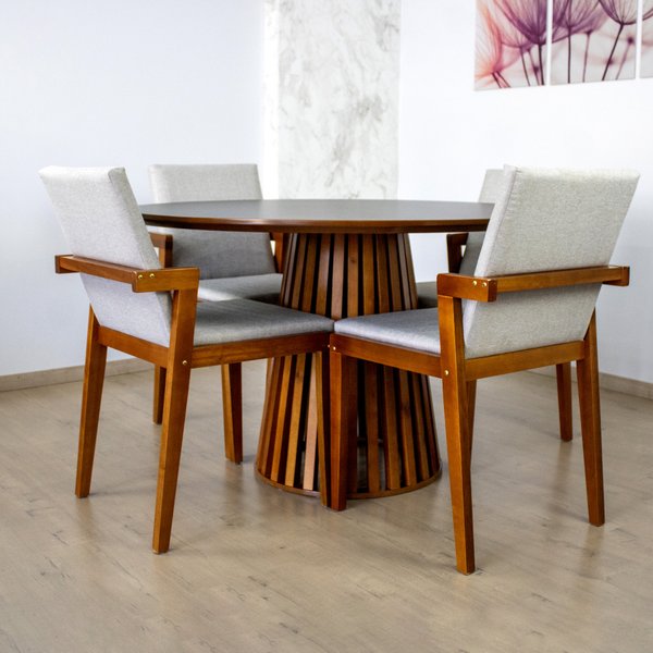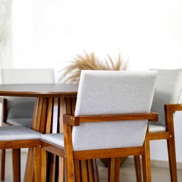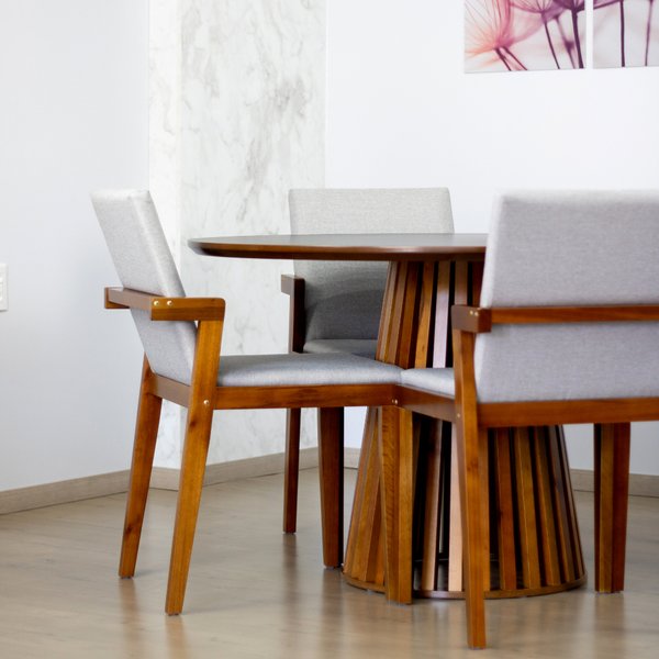 A Mesa Redonda Luna possui um design moderno e sofisticado, sua estrutura em madeira maciça mesclada com as cores suaves do seu tampo dão um toque natural e aconchegante ao seu ambiente. A Cadeira Estofada Isabela se destaca pela sua beleza e conforto, seu assento e encosto estofados garantem comodidade durante as suas refeições! Disponível em diversas opções de cores a Mesa Luana com as Cadeiras Isabela é uma excelente escolha para quem busca um estilo de vida moderno e sofisticado!