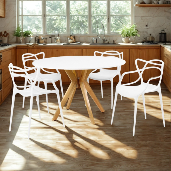 Transforme sua sala de jantar com o Conjunto Mesa de Jantar Redonda Marci com 4 Cadeiras Allegra. Este conjunto combina design moderno, conforto e materiais de alta qualidade para oferecer funcionalidade e estilo a diversos ambientes — de salas de jantar e cozinhas a restaurantes e espaços comerciais sofisticados.