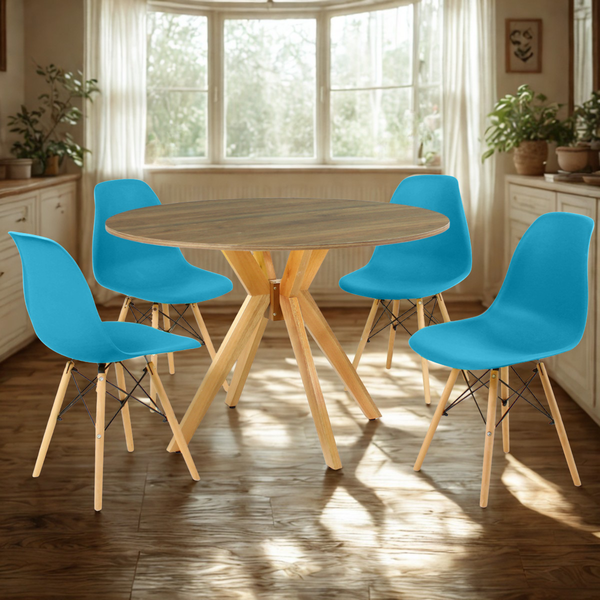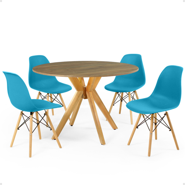 Conjunto Mesa de Jantar Redonda Marci Natural 100cm com 4 Cadeiras Eames Eiffel Turquesa