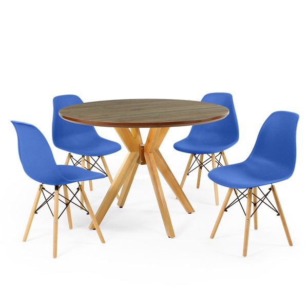 Conjunto Mesa de Jantar Redonda Marci Premium Natural 100cm com 4 Cadeiras Eames Eiffel Azul