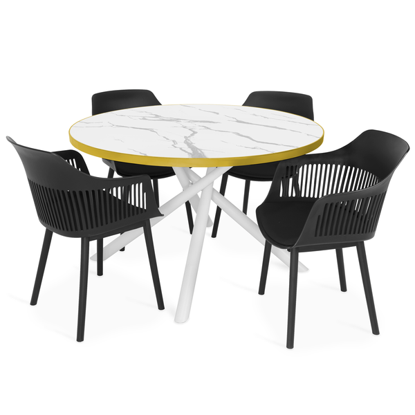 O conjunto de mesa de jantar redonda Solaris branca 120cm com 4 cadeiras Marcela é a escolha ideal para quem busca unir elegância, modernidade e funcionalidade em um único produto. Seu tampo marmorizado sintético reproduz com fidelidade os veios do mármore natural, oferecendo um visual sofisticado e atual, sem abrir mão da praticidade no uso diário. A borda dourada adiciona um toque de requinte, tornando o conjunto um destaque na decoração de qualquer ambiente. O formato redondo da mesa é perfeito para otimizar espaços e promover maior interação entre as pessoas, criando uma atmosfera mais acolhedora em refeições, encontros e momentos especiais.