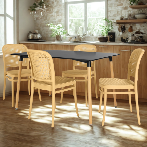 O conjunto acompanha 4 Cadeiras Roma, projetadas para oferecer charme ao ambiente. Com um encosto confortável e acabamento inspirado no rattan, essas cadeiras são ideais para uso diário, proporcionando bem-estar durante todas as refeições.