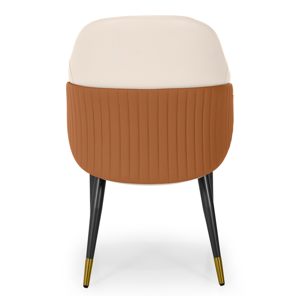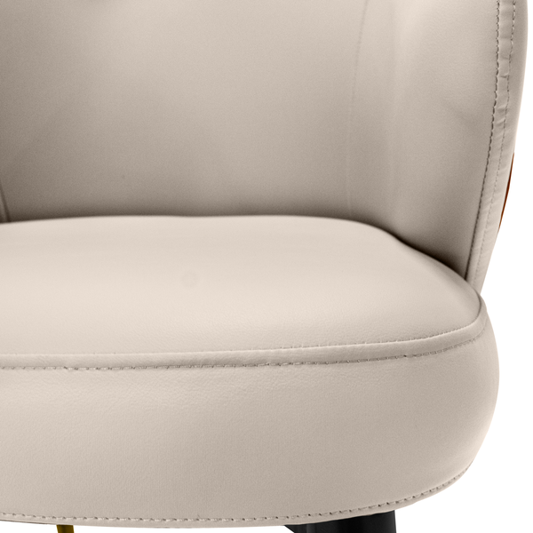 A Cadeira Estofada Milano possui revestimento em PU de toque macio, fácil de limpar e ideal para uso diário. Sua parte externa conta com um elegante botão dourado que adiciona um charme artesanal ao design.