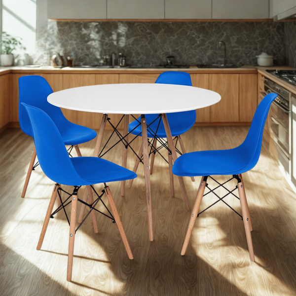 A mesa de 120cm possui tampo em MDF e base em madeira maciça com hastes metálicas, garantindo resistência e sofisticação. Já as cadeiras Eames têm assento em polipropileno, estrutura reforçada e design atemporal.