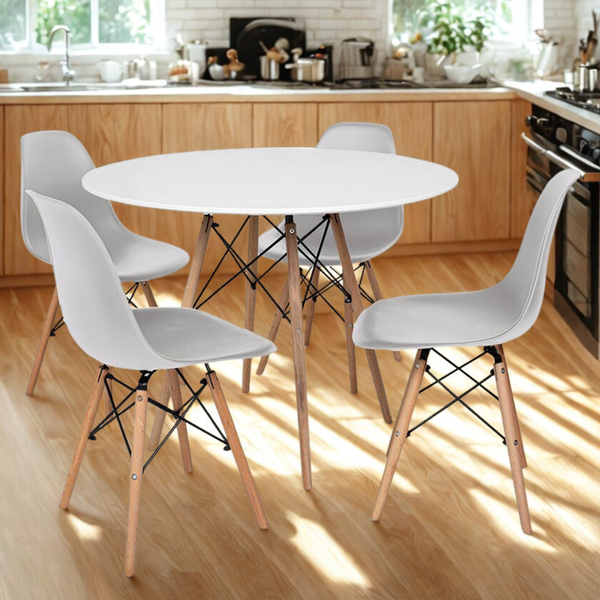 A mesa de 120cm possui tampo em MDF e base em madeira maciça com hastes metálicas, garantindo resistência e sofisticação. Já as cadeiras Eames têm assento em polipropileno, estrutura reforçada e design atemporal.