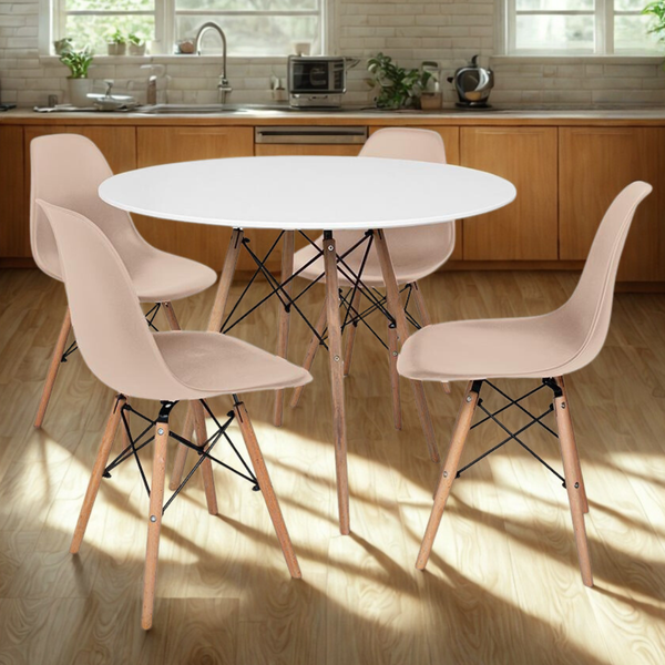 A mesa de 120cm possui tampo em MDF e base em madeira maciça com hastes metálicas, garantindo resistência e sofisticação. Já as cadeiras Eames têm assento em polipropileno, estrutura reforçada e design atemporal.