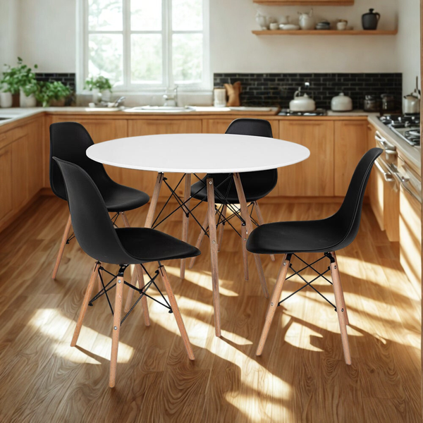 A mesa de 120cm possui tampo em MDF e base em madeira maciça com hastes metálicas, garantindo resistência e sofisticação. Já as cadeiras Eames têm assento em polipropileno, estrutura reforçada e design atemporal.